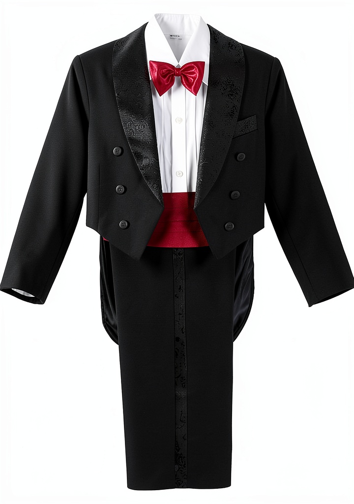 The set includes a tuxedo jacket with tails, a white shirt, trousers, an adjustable satin bow tie, and either an elastic cummerbund or a fully lined vest, depending on the option selected.