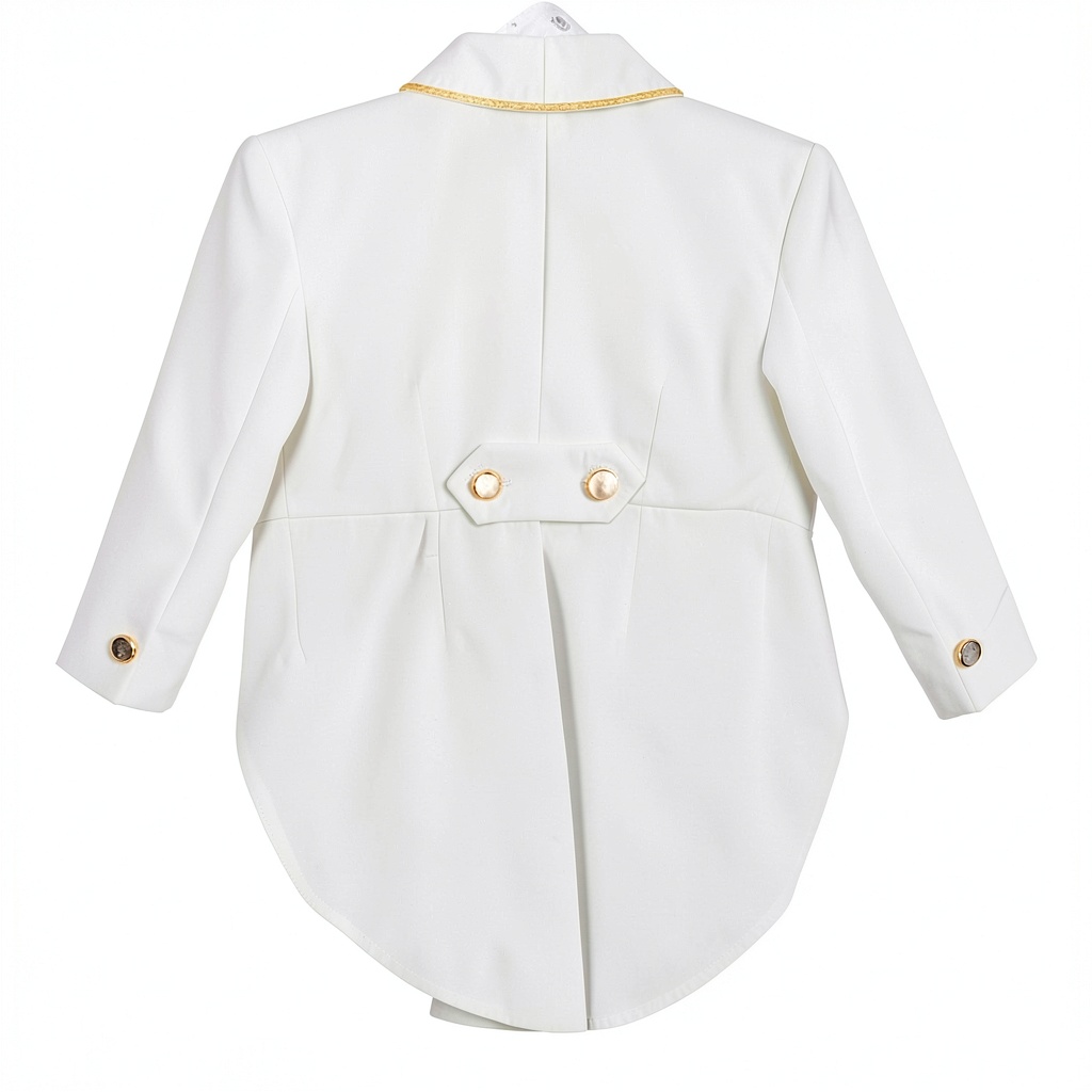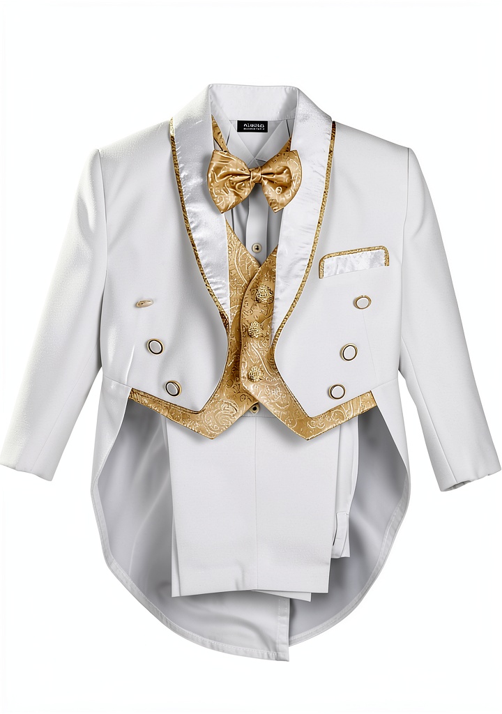 - Double-breasted jacket with tails and fully lined vest for a structured, polished finish