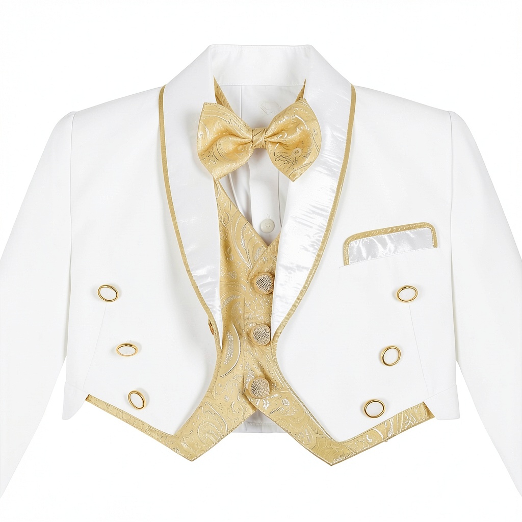 The Lito Angels Baby Boys’ Jacquard Classic Tuxedo Suit is a premium 5-piece formal set designed for special occasions. Crafted from high-quality jacquard fabric, this ensemble includes a double-breasted jacket with formal tails, a crisp white shirt with a winged collar and pin tuck pleats, a matching vest, an adjustable satin bow tie, and smart trousers with an elastic waistband. The set is available in sizes ranging from 12-18 months to 3-4T, with color options of White With Gold and Black With Gold, ensuring a perfect fit and elegant style for young boys. Each piece is meticulously constructed to provide durability and a polished appearance, making it ideal for weddings, parties, and formal events.
