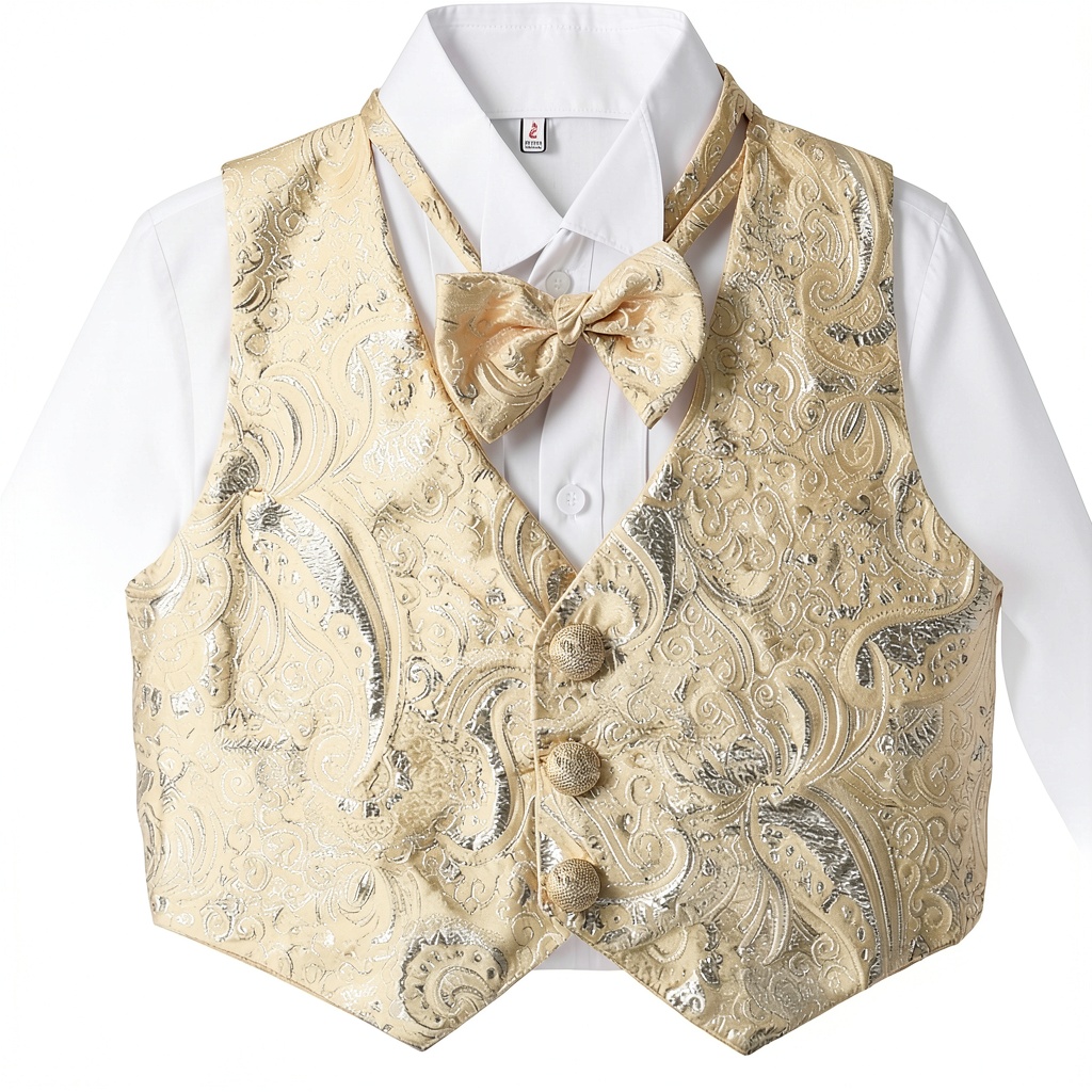 - Complete 5-piece set with jacket, shirt, vest, bow tie, and trousers for a ready-to-wear formal look