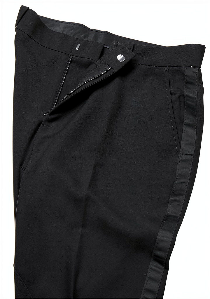 - Flat-front trousers with satin-trimmed stripes and zip fly for comfort and style