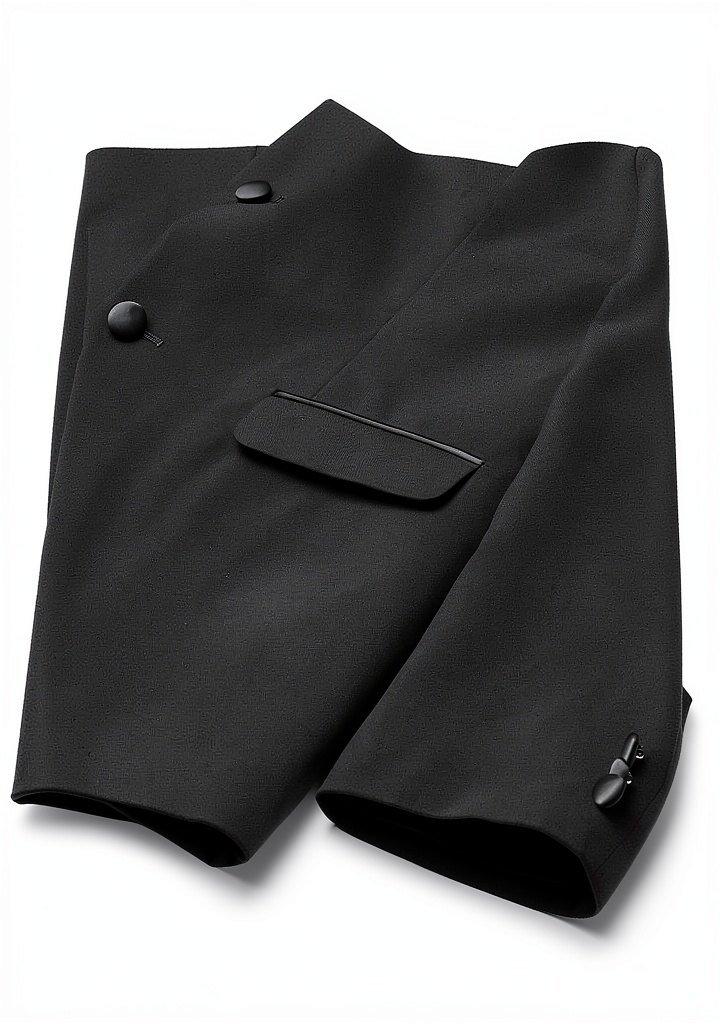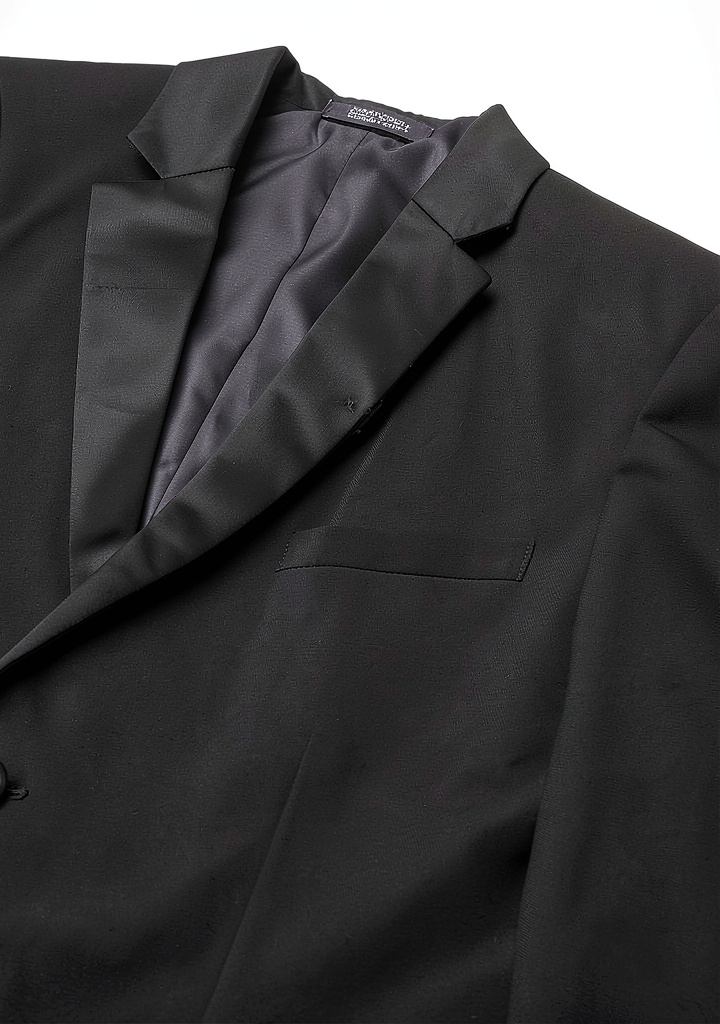 - Classic satin lapel jacket with two-button closure for a sharp, timeless look